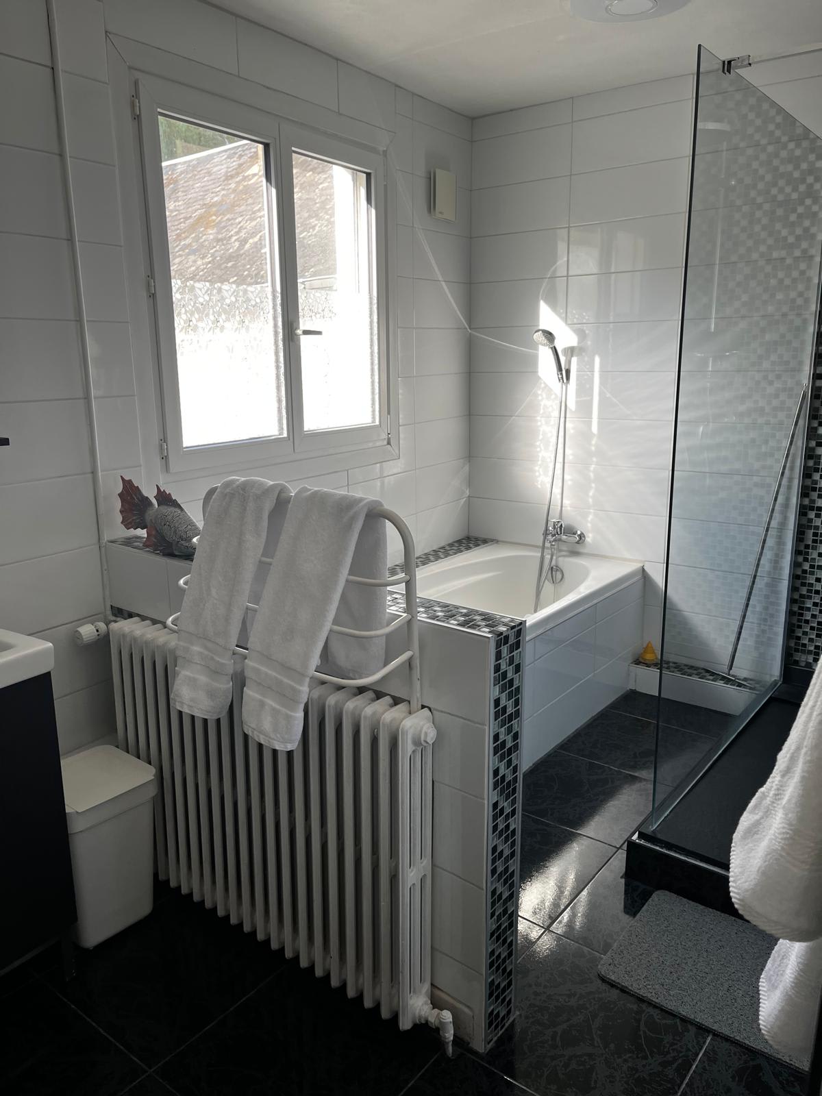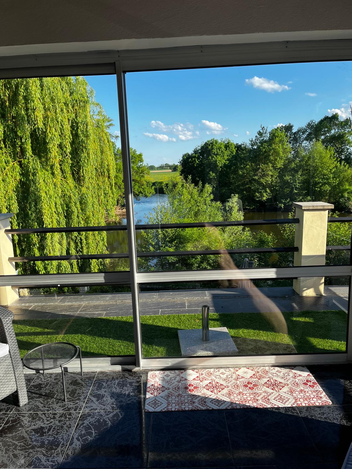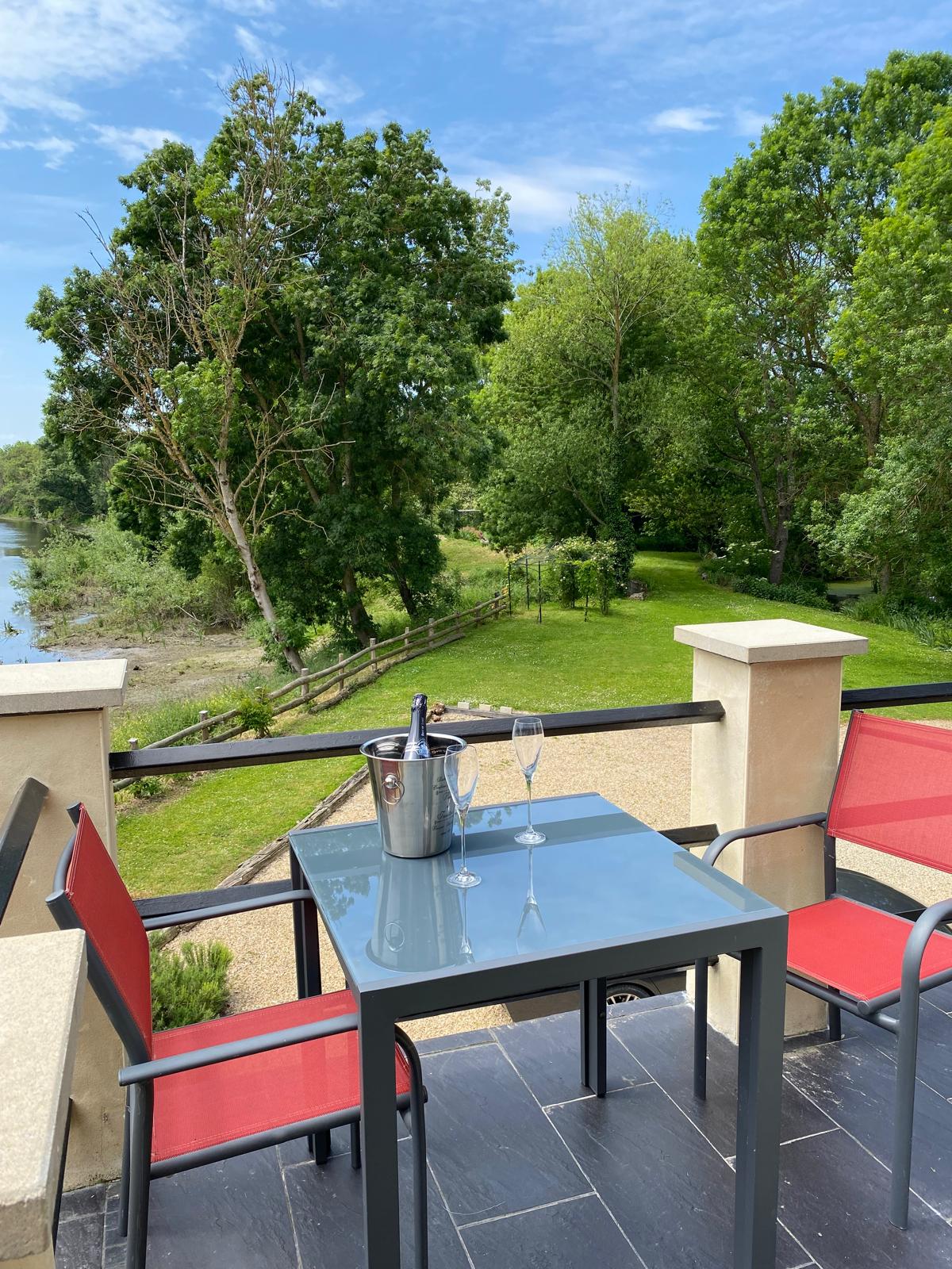 The gîte sleeps two to four guests comfortably. The master bedroom offers serene river views, while the second double bedroom overlooks the lush orchard and gardens. The modern bathroom is designed for indulgence, featuring a full-size bathtub and a separate, large walk-in rainfall shower. An independent toilet adds extra convenience.